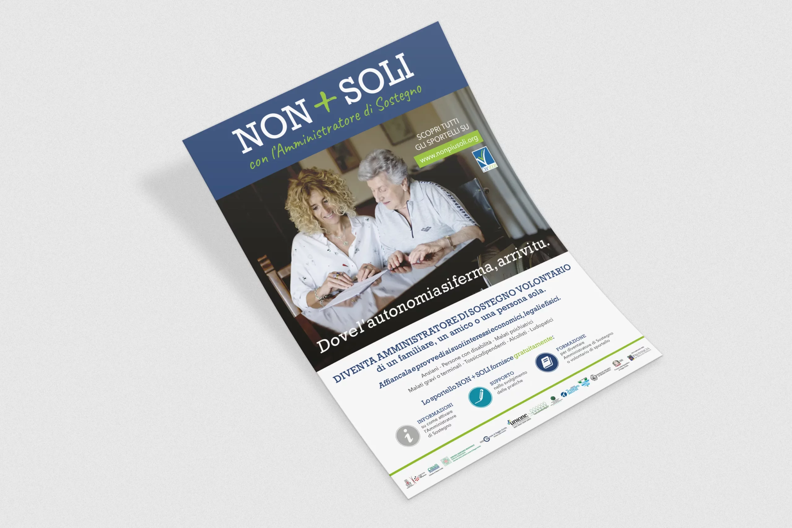 Il risultato è un’identità che rafforza la riconoscibilità di Non+Soli e accompagna la comunicazione con equilibrio, aiutando il progetto a presentarsi in modo ordinato, professionale e vicino alle persone.